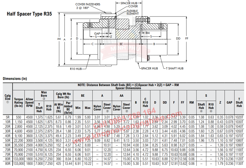 • Standard covers are nylon for sizes 5R - 50R and black epoxy-coated steel for sizes 60R - 80R.