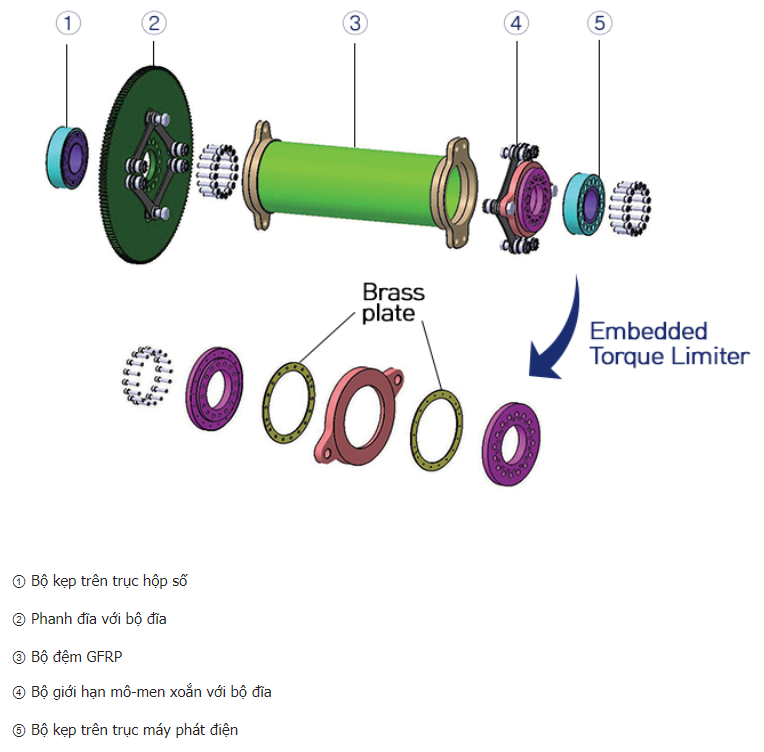 • Bộ giới hạn mô-men xoắn: Khi xảy ra tình trạng quá tải vượt quá mô-men xoắn quy định, Bộ phận trượt được gắn trong bộ giới hạn mô-men xoắn sẽ cắt nguồn điện để bảo vệ các bộ phận của bộ truyền lực và nó hoạt động mà không bị giảm mô-men xoắn đáng kể trong suốt thời gian sử dụng. Nó được áp dụng cho hơn 2MW.